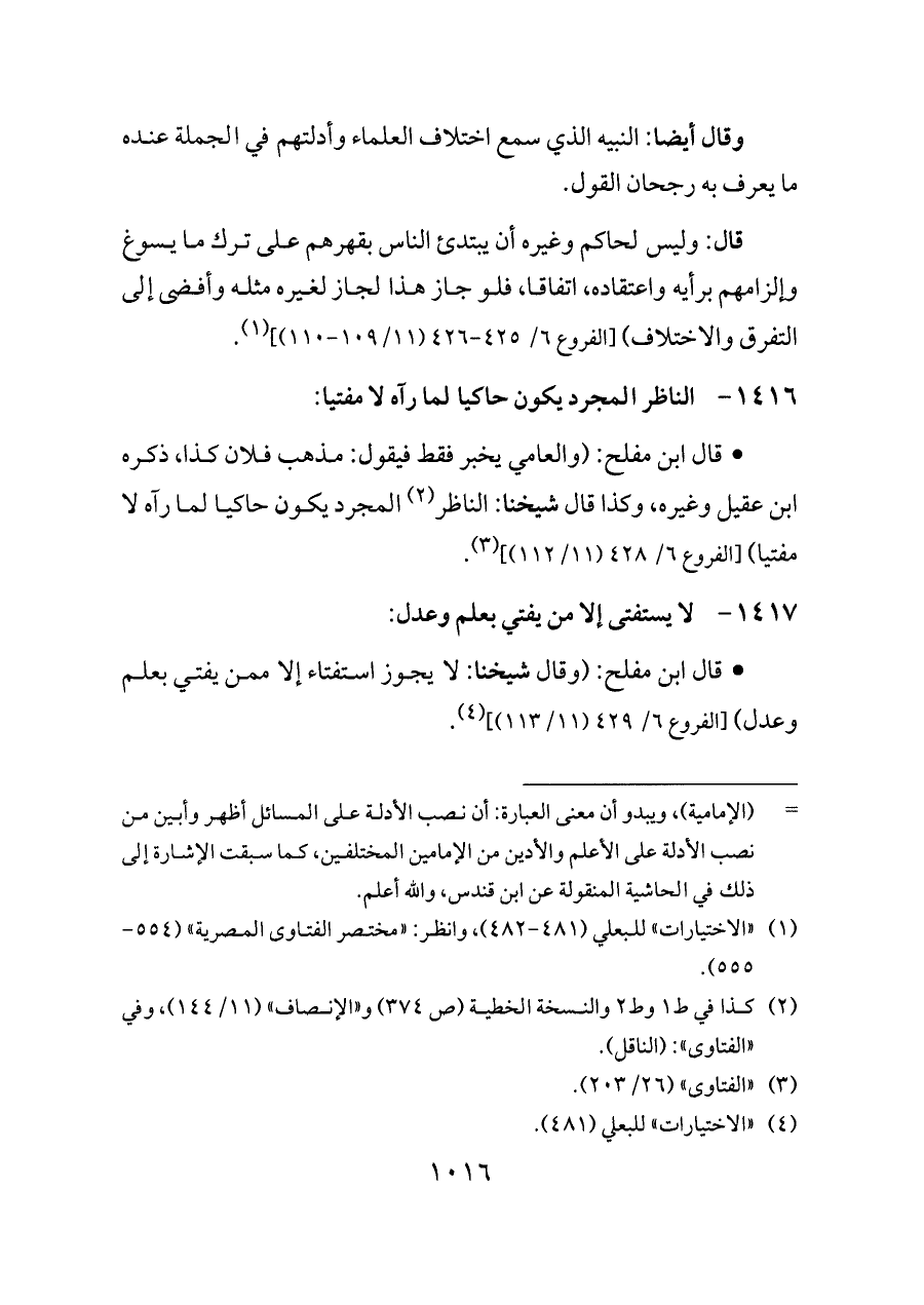 - قال ابن مفلح: (والعامي يخبر فقط فيقول: مذهب فلان كذا، ذكره ابن عقيل وغيره، وكذا قال شيخنا: الناظر (¬٢) المجرد يكون حاكيا لما رآه لا مفتيا) [الفروع ٦/ ٤٢٨ (١١/ ١١٢)] (¬٣).