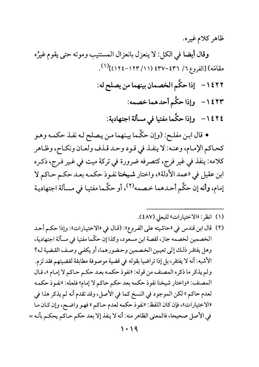 ولم يذكر ما ذكره المصنف من قوله: «نفوذ حكمه بعد حكم حاكم لا إمام»، قال المصنف: «واختار شيخنا نفوذ حكمه بعد حكم حاكم لا إمام» فلعله: «نفوذ حكمه لعدم حاكم» لكن الموجود في النسخ كما في الأصل، وقد تقدم أنه لم يذكر هذا في «الاختيارات»، فإن كان اللفظ: «نفوذ حكمه لعدم حاكم» فهو واضح، وإن كان ما في الأصل صحيحا، فالمعنى الظاهر منه: أنه لا ينفذ إلا بعد حكم حاكم يحكم بأنه نافذ، ويكون ذلك من باب ما إذا كان نفس الحكم مختلفا فيه، لا يلزم تنفيذه إلا أن يحكم به حاكم، كالحكم على الغائب، والحكم بالشاهد واليمين، على ما ذكره صاحب «المحرر»، والظاهر أن الأول أولى، وأن اللفظ حصل فيه تغيير، والله أعلم).
