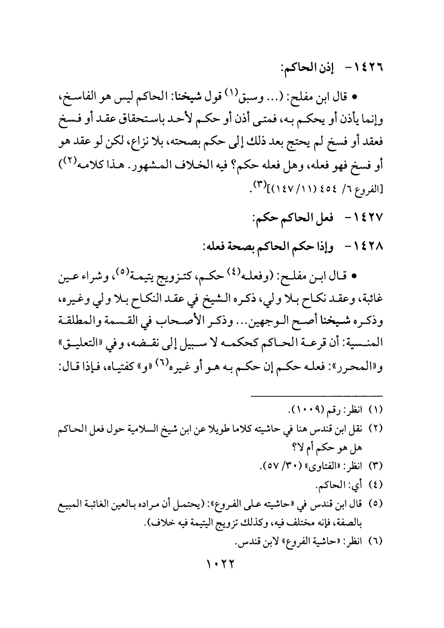 (¬٢) نقل ابن قندس هنا في حاشيته كلاما طويلا عن ابن شيخ السلامية حول فعل الحاكم هل هو حكم أم لا؟
