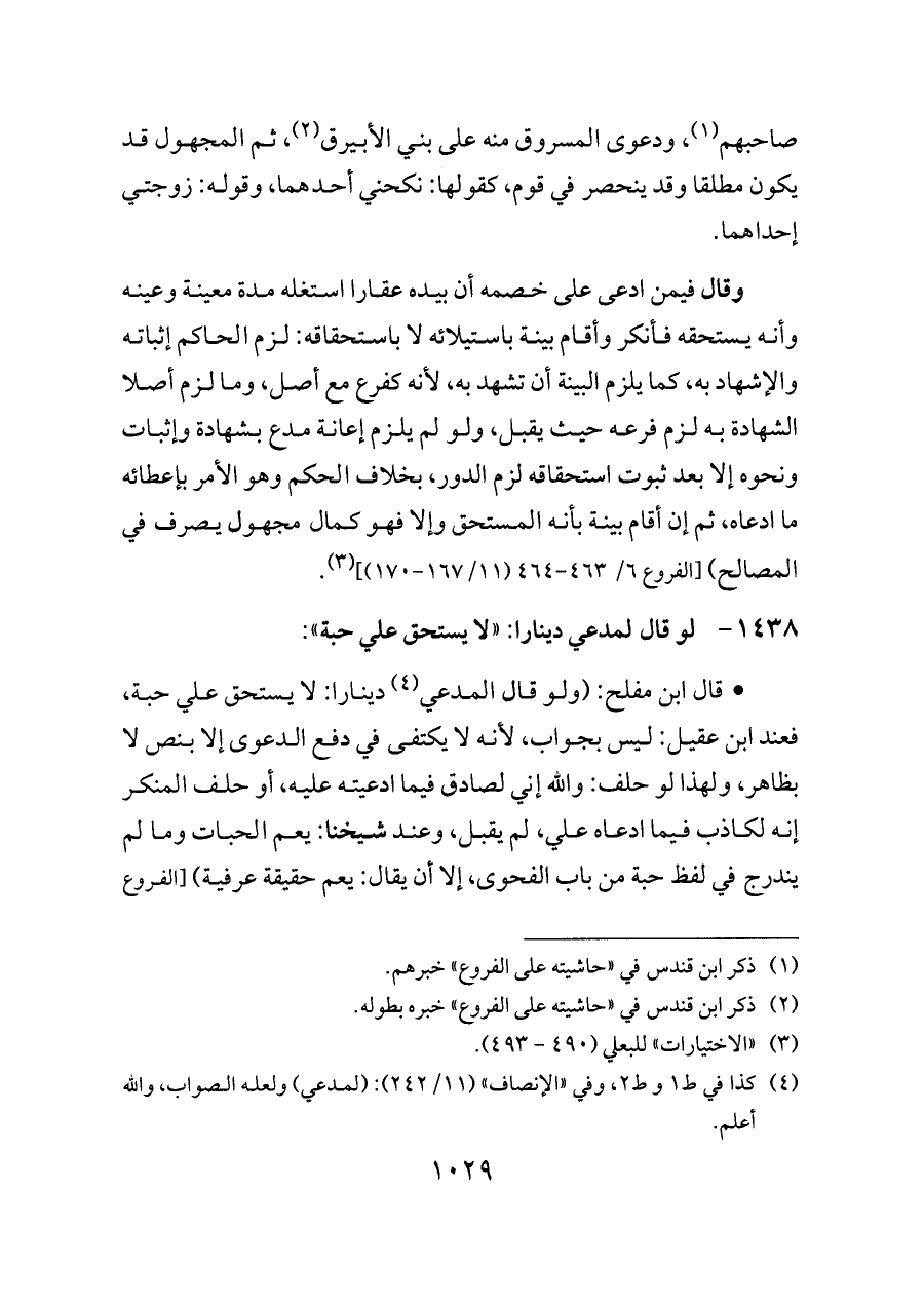 ١٤٣٨ - لو قال لمدعي دينارا: «لا يستحق علي حبة»: