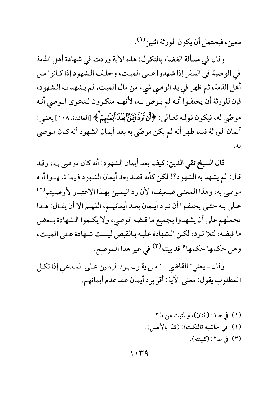 قال الشيخ تقي الدين: كيف بعد أيمان الشهود: أنه كان موصى به، وقد قال: لم يشهد به الشهود؟ ! لكن كأنه قصد بعد أيمان الشهود فيما شهدوا أنه موصى به، وهذا المعنى ضعيف؛ لأن رد اليمين بهذا الاعتبار لأوصيتم (¬٢) على به حتى يحلفوا أن ترد أيمان بعد أيمانهم، اللهم إلا أن يقال: هذا يحملهم على أن يشهدوا بجميع ما قبضه الوصي، ولا يكتموا الشهادة ببعض ما قبضه، لئلا ترد، لكن الشهادة عليه بالقبض ليست شهادة على الميت، وهل حكمها حكمها؟ قد بينته (¬٣) في غير هذا الموضع.