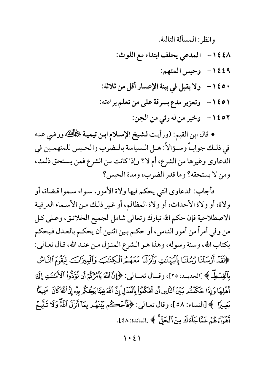 - قال ابن القيم: (ورأيت لشيخ الإسلام ابن تيمية - رحمه الله - ورضي عنه في ذلك جواباً وسؤالاً: هل السياسة بالضرب والحبس للمتهمين في الدعاوى وغيرها من الشرع، أم لا؟ وإذا كانت من الشرع فمن يستحق ذلك، ومن لا يستحقه؟ وما قدر الضرب، ومدة الحبس؟