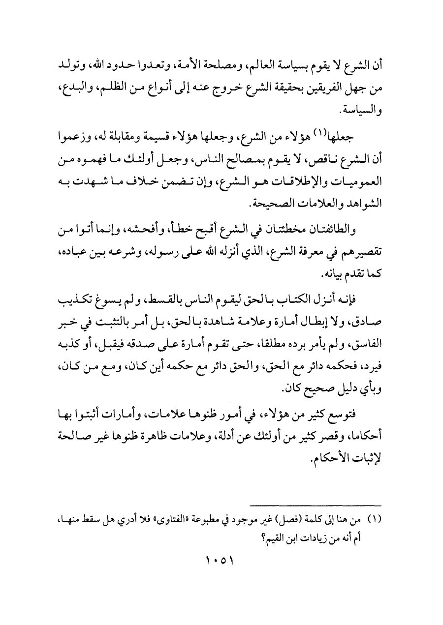 أن الشرع لا يقوم بسياسة العالم، ومصلحة الأمة، وتعدوا حدود الله، وتولد من جهل الفريقين بحقيقة الشرع خروج عنه إلى أنواع من الظلم، والبدع، والسياسة.