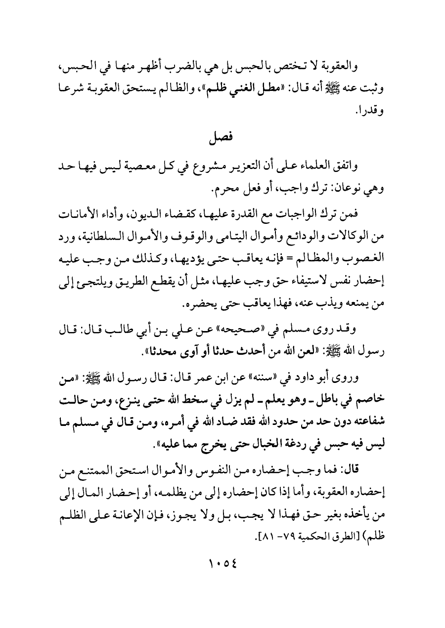 والعقوبة لا تختص بالحبس بل هي بالضرب أظهر منها في الحبس، وثبت عنه - صلى الله عليه وسلم - أنه قال: «مطل الغني ظلم»، والظالم يستحق العقوبة شرعا وقدرا.