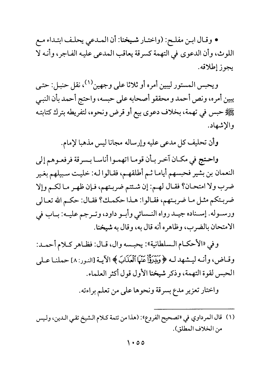 - وقال ابن مفلح: (واختار شيخنا: أن المدعي يحلف ابتداء مع اللوث، وأن الدعوى في التهمة كسرقة يعاقب المدعى عليه الفاجر، وأنه لا يجوز إطلاقه.