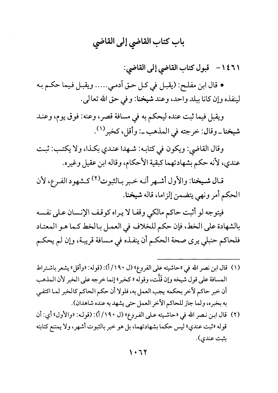 (¬١) قال ابن نصر الله في «حاشيته على الفروع» (ل ١٩٠/أ): (قوله: «وأقل» يشعر باشتراط المسافة على قول شيخه وإن قَلَّت، وقوله «كخبر» إنما خرجه على الخبر لأن المذهب أن خبر حاكم لآخر بحكمه يجب العمل به، فلولا أن حكم الحاكم كالخبر لما اكتفي به بخبره، ولما جاز للحاكم الآخر العمل حتى يشهد به عنده شاهدان).