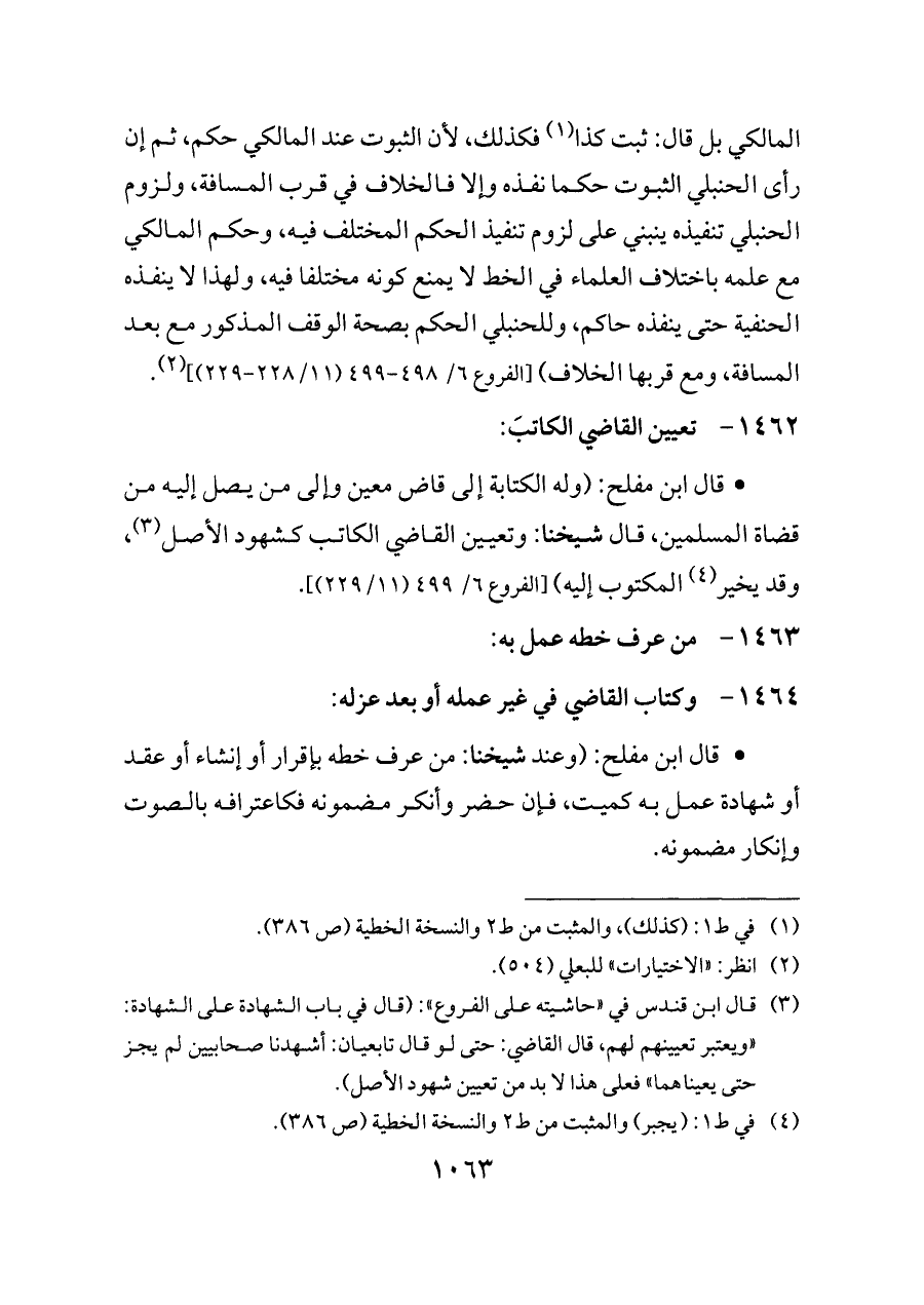 المالكي بل قال: ثبت كذا (¬١) فكذلك، لأن الثبوت عند المالكي حكم، ثم إن رأى الحنبلي الثبوت حكما نفذه وإلا فالخلاف في قرب المسافة، ولزوم الحنبلي تنفيذه ينبني على لزوم تنفيذ الحكم المختلف فيه، وحكم المالكي مع علمه باختلاف العلماء في الخط لا يمنع كونه مختلفا فيه، ولهذا لا ينفذه الحنفية حتى ينفذه حاكم، وللحنبلي الحكم بصحة الوقف المذكور مع بعد المسافة، ومع قربها الخلاف) [الفروع ٦/ ٤٩٨ - ٤٩٩ (١١/ ٢٢٨ - ٢٢٩)] (¬٢).