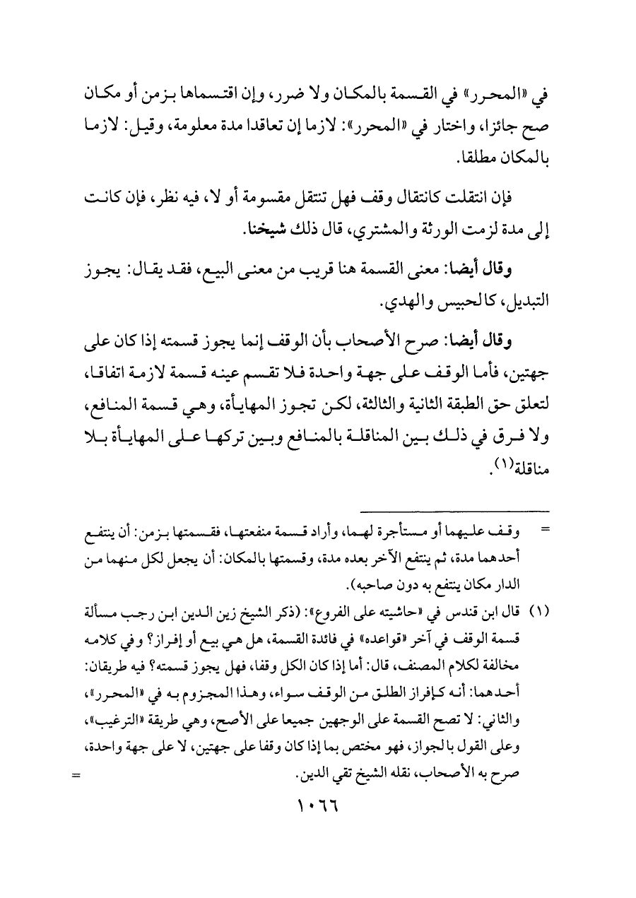(¬١) قال ابن قندس في «حاشيته على الفروع»: (ذكر الشيخ زين الدين ابن رجب مسألة قسمة الوقف في آخر «قواعده» في فائدة القسمة، هل هي بيع أو إفراز؟ وفي كلامه مخالفة لكلام المصنف، قال: أما إذا كان الكل وقفا، فهل يجوز قسمته؟ فيه طريقان: أحدهما: أنه كإفراز الطلق من الوقف سواء، وهذا المجزوم به في «المحرر»، والثاني: لا تصح القسمة على الوجهين جميعا على الأصح، وهي طريقة «الترغيب»، وعلى القول بالجواز، فهو مختص بما إذا كان وقفا على جهتين، لا على جهة واحدة، صرح به الأصحاب، نقله الشيخ تقي الدين.