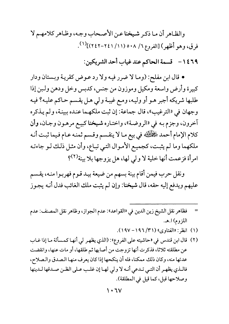 - قال ابن مفلح: (وما لا ضرر فيه ولا رد عوض كقرية وبستان ودار كبيرة وأرض واسعة ومكيل وموزون من جنس، كدبس وخل ودهن ولبن إذا طلبها شريكه أجبر هو أو وليه، ومع غيبة ولي هل يقسم حاكم عليه؟ فيه وجهان في «الترغيب»، قال جماعة: إن ثبت ملكهما عنده ببينة، ولم يذكره آخرون، وجزم به في «الروضة»، واختاره شيخنا كبيع مرهون وجان، وأن كلام الإمام أحمد - رحمه الله - في بيع ما لا ينقسم وقسم ثمنه عام فيما ثبت أنه ملكهما وما لم يثبت، كجميع الأموال التي تباع، وأن مثل ذلك لو جاءته امرأة فزعمت أنها خلية لا ولي لها، هل يزوجها بلا بينة (¬٢)؟