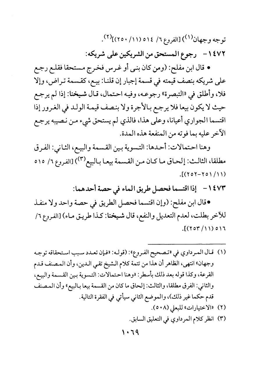 (¬١) قال المرداوي في «تصحيح الفروع»: (قوله: «فإن تعدد سبب استحقاقه توجه وجهان» انتهى، الظاهر أن هذا من تتمة كلام الشيخ تقي الدين، وأن المصنف قدم القرعة، وكذا قوله بعد ذلك بأسطر: «وهنا احتمالات: التسوية بين القسمة والبيع، والثاني: الفرق مطلقا، والثالث: إلحاق ما كان من القسمة بيعا بالبيع» وأن المصنف قدم حكما غير ذلك)، والموضع الثاني سيأتي في الفقرة التالية.