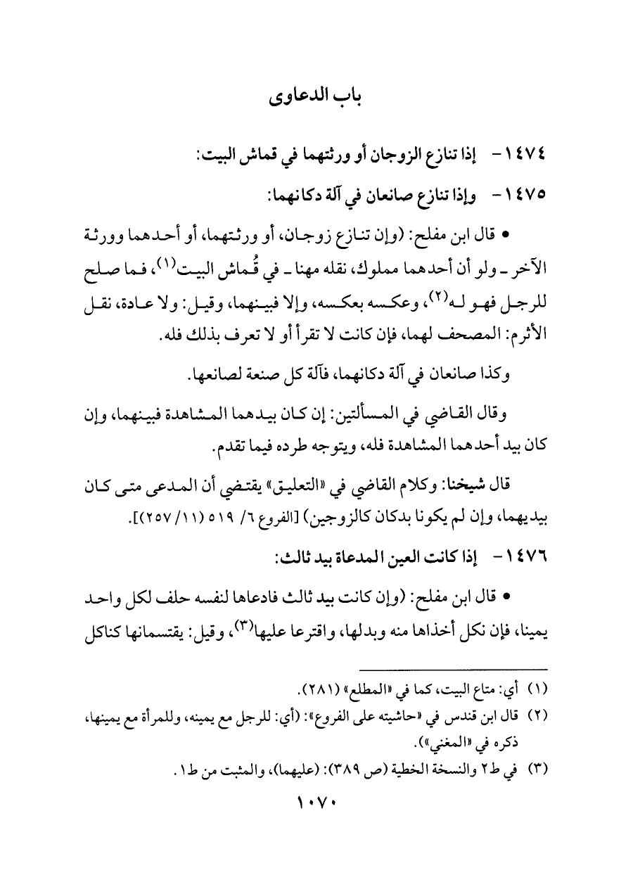 - قال ابن مفلح: (وإن تنازع زوجان، أو ورثتهما، أو أحدهما وورثة الآخر ــ ولو أن أحدهما مملوك، نقله مهنا ــ في قُماش البيت (¬١)، فما صلح للرجل فهو له (¬٢)، وعكسه بعكسه، وإلا فبينهما، وقيل: ولا عادة، نقل الأثرم: المصحف لهما، فإن كانت لا تقرأ أو لا تعرف بذلك فله.