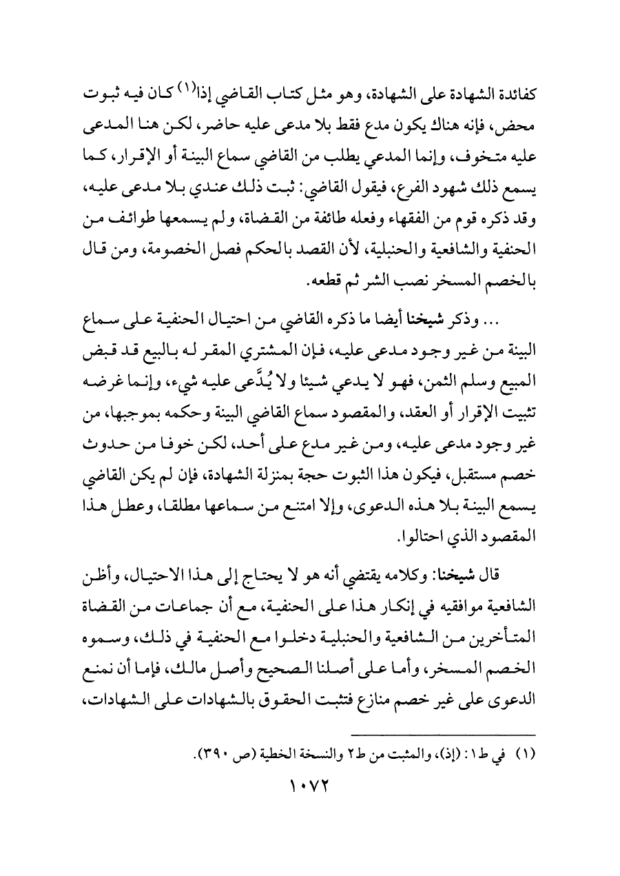 قال شيخنا: وكلامه يقتضي أنه هو لا يحتاج إلى هذا الاحتيال، وأظن الشافعية موافقيه في إنكار هذا على الحنفية، مع أن جماعات من القضاة المتأخرين من الشافعية والحنبلية دخلوا مع الحنفية في ذلك، وسموه الخصم المسخر، وأما على أصلنا الصحيح وأصل مالك، فإما أن نمنع الدعوى على غير خصم منازع فتثبت الحقوق بالشهادات على الشهادات،