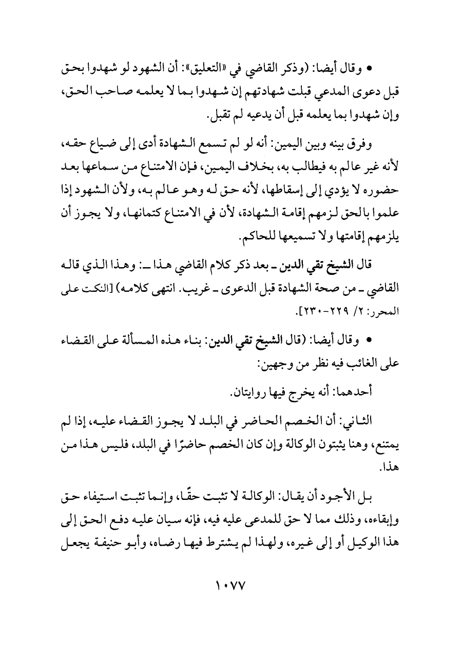 قال الشيخ تقي الدين ــ بعد ذكر كلام القاضي هذا ــ: وهذا الذي قاله القاضي ــ من صحة الشهادة قبل الدعوى ــ غريب. انتهى كلامه) [النكت على المحرر: ٢/ ٢٢٩ - ٢٣٠].