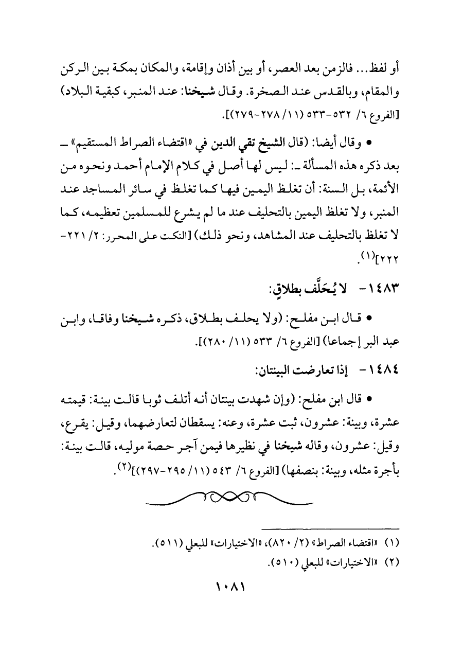 - وقال أيضا: (قال الشيخ تقي الدين في «اقتضاء الصراط المستقيم» ــ بعد ذكره هذه المسألة ــ: ليس لها أصل في كلام الإمام أحمد ونحوه من الأئمة، بل السنة: أن تغلظ اليمين فيها كما تغلظ في سائر المساجد عند المنبر، ولا تغلظ اليمين بالتحليف عند ما لم يشرع للمسلمين تعظيمه، كما لا تغلظ بالتحليف عند المشاهد، ونحو ذلك) [النكت على المحرر: ٢/ ٢٢١ - ٢٢٢] (¬١).