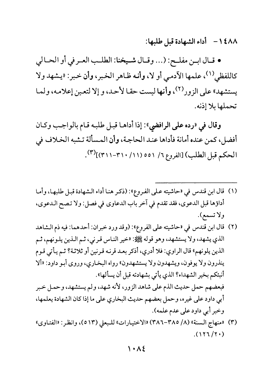- قال ابن مفلح: ( ... وقال شيخنا: الطلب العرفي أو الحالي كاللفظي (¬١)، علمها الآدمي أو لا، وأنه ظاهر الخبر، وأن خبر: «يشهد ولا يستشهد» على الزور (¬٢)، وأنها ليست حقا لأحد، وإلا لتعين إعلامه، ولما تحملها بلا إذنه.