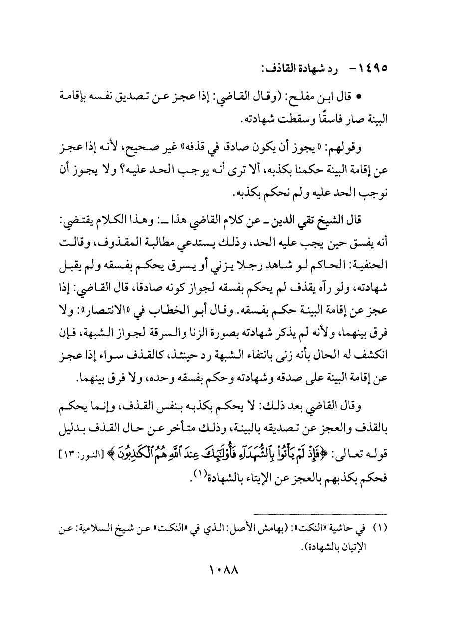قال الشيخ تقي الدين ــ عن كلام القاضي هذا ــ: وهذا الكلام يقتضي: أنه يفسق حين يجب عليه الحد، وذلك يستدعي مطالبة المقذوف، وقالت الحنفية: الحاكم لو شاهد رجلا يزني أو يسرق يحكم بفسقه ولم يقبل شهادته، ولو رآه يقذف لم يحكم بفسقه لجواز كونه صادقا، قال القاضي: إذا عجز عن إقامة البينة حكم بفسقه. وقال أبو الخطاب في «الانتصار»: ولا فرق بينهما، ولأنه لم يذكر شهادته بصورة الزنا والسرقة لجواز الشبهة، فإن انكشف له الحال بأنه زنى بانتفاء الشبهة رد حينئذ، كالقذف سواء إذا عجز عن إقامة البينة على صدقه وشهادته وحكم بفسقه وحده، ولا فرق بينهما.