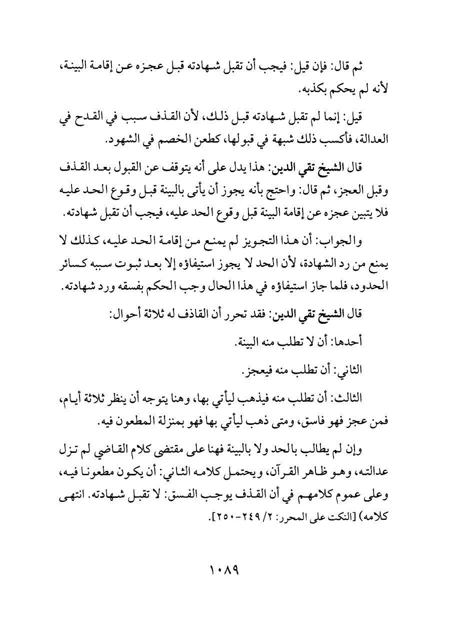 قال الشيخ تقي الدين: هذا يدل على أنه يتوقف عن القبول بعد القذف وقبل العجز، ثم قال: واحتج بأنه يجوز أن يأتى بالبينة قبل وقوع الحد عليه فلا يتبين عجزه عن إقامة البينة قبل وقوع الحد عليه، فيجب أن تقبل شهادته.
