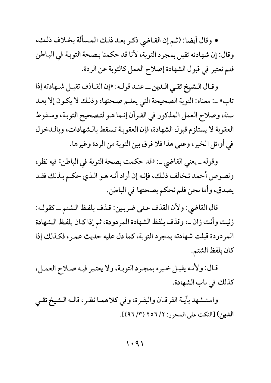 وقال الشيخ تقي الدين ــ عند قوله: «إن القاذف تقبل شهادته إذا تاب» ــ: معناه: التوبة الصحيحة التي يعلم صحتها، وذلك لا يكون إلا بعد سنة، وصلاح العمل المذكور في القرآن إنما هو لتصحيح التوبة، وسقوط العقوبة لا يستلزم قبول الشهادة، فإن العقوبة تسقط بالشهادات، وبالدخول في أوائل الخير، وعلى هذا فلا فرق بين التوبة من الردة وغيرها.