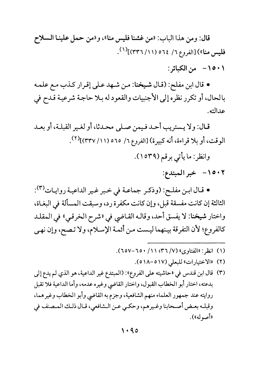 قال: ومن هذا الباب: «من غشنا فليس منا»، و «من حمل علينا السلاح فليس منا») [الفروع ٦/ ٥٦٤ (١١/ ٣٣٦)] (¬١).