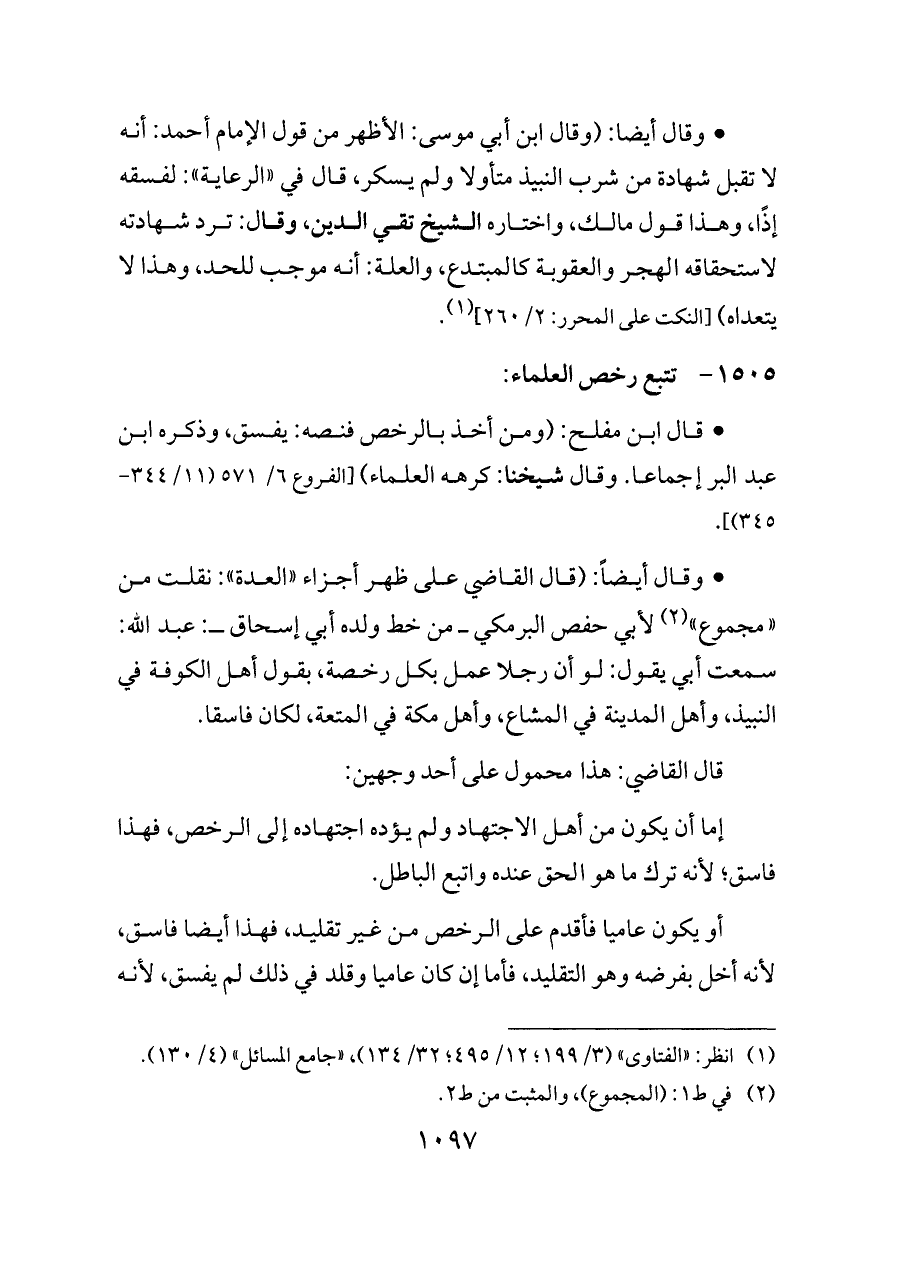 - قال ابن مفلح: (ومن أخذ بالرخص فنصه: يفسق، وذكره ابن عبد البر إجماعا. وقال شيخنا: كرهه العلماء) [الفروع ٦/ ٥٧١ (١١/ ٣٤٤ - ٣٤٥)].