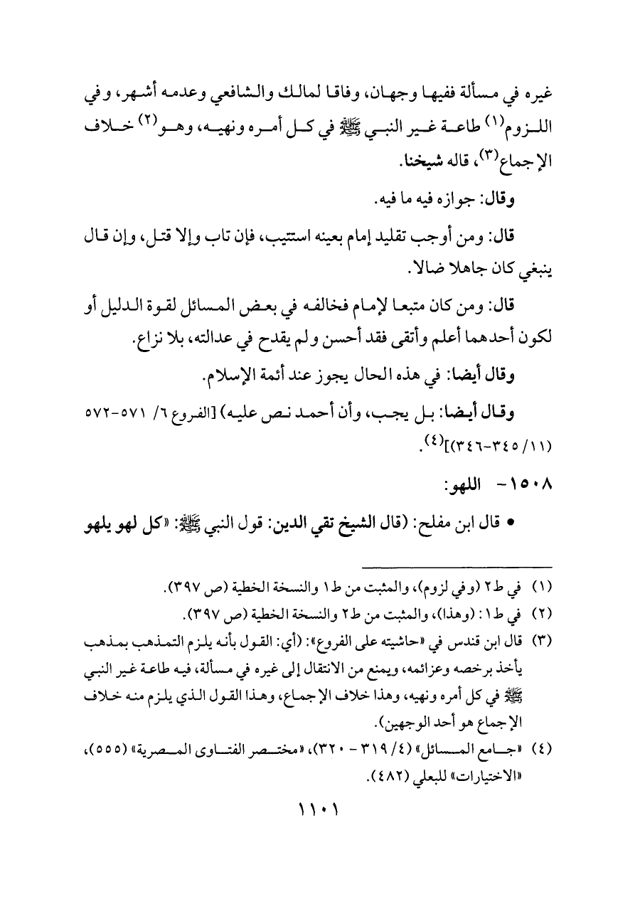 (¬٣) قال ابن قندس في «حاشيته على الفروع»: (أي: القول بأنه يلزم التمذهب بمذهب يأخذ برخصه وعزائمه، ويمنع من الانتقال إلى غيره في مسألة، فيه طاعة غير النبي - صلى الله عليه وسلم - في كل أمره ونهيه، وهذا خلاف الإجماع، وهذا القول الذي يلزم منه خلاف الإجماع هو أحد الوجهين).