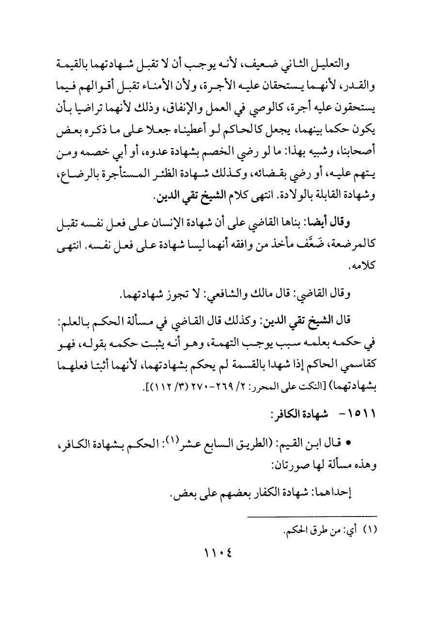 - قال ابن القيم: (الطريق السابع عشر (¬١): الحكم بشهادة الكافر، وهذه مسألة لها صورتان: