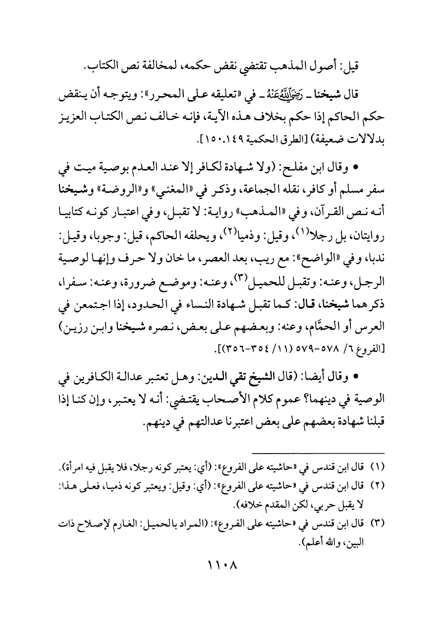 قال شيخنا ــ - رضي الله عنه - ــ في «تعليقه على المحرر»: ويتوجه أن ينقض حكم الحاكم إذا حكم بخلاف هذه الآية، فإنه خالف نص الكتاب العزيز بدلالات ضعيفة) [الطرق الحكمية ١٤٩ ـ ١٥٠].