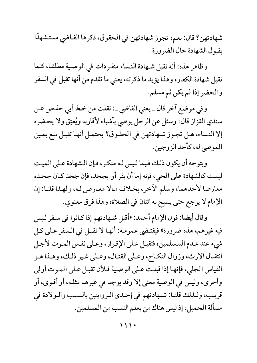 وقال أيضا: قول الإمام أحمد: «أقبل شهادتهم إذا كانوا في سفر ليس فيه غيرهم، هذه ضرورة» فيقتضى عمومه: أنها لا تقبل في السفر على كل شيء عند عدم المسلمين، فتقبل على الإقرار، وعلى نفس الموت لأجل انتقال الإرث، وزوال النكاح، وعلى القتال، وعلى غير ذلك، وهذا هو القياس الجلي، فإنها إذا قبلت على الوصية فلأن تقبل على الموت أولى وأحرى، وليس في الوصية معنى إلا وقد يوجد في غيرها مثله، أو أقوى، أو قريب، ولذلك قلنا: شهادتهم في إحدى الروايتين بالنسب والولادة في مسألة الحميل، إذ ليس هناك من يعلم النسب من المسلمين.