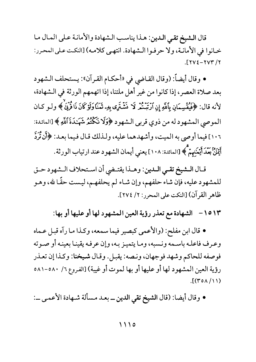 - وقال أيضا: (قال الشيخ تقي الدين ــ بعد مسألة شهادة الأعمى ــ: