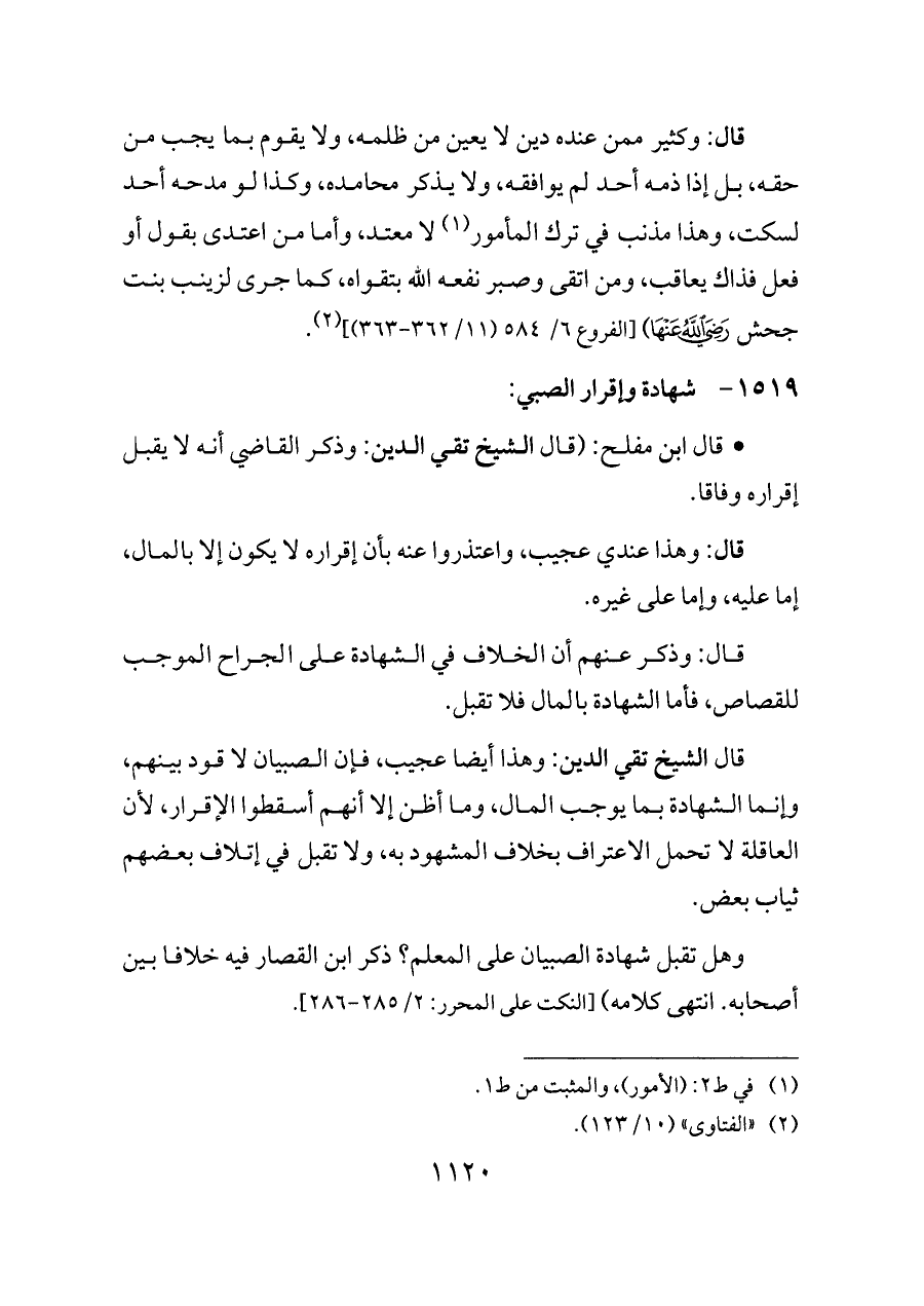 قال الشيخ تقي الدين: وهذا أيضا عجيب، فإن الصبيان لا قود بينهم، وإنما الشهادة بما يوجب المال، وما أظن إلا أنهم أسقطوا الإقرار، لأن العاقلة لا تحمل الاعتراف بخلاف المشهود به، ولا تقبل في إتلاف بعضهم ثياب بعض.