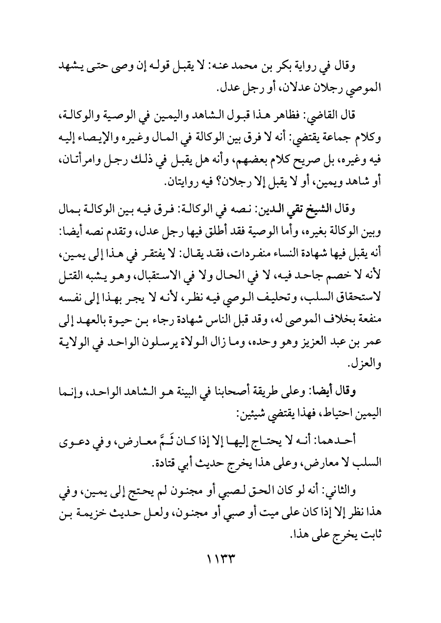 وقال الشيخ تقي الدين: نصه في الوكالة: فرق فيه بين الوكالة بمال وبين الوكالة بغيره، وأما الوصية فقد أطلق فيها رجل عدل، وتقدم نصه أيضا: أنه يقبل فيها شهادة النساء منفردات، فقد يقال: لا يفتقر في هذا إلى يمين، لأنه لا خصم جاحد فيه، لا في الحال ولا في الاستقبال، وهو يشبه القتل لاستحقاق السلب، وتحليف الوصي فيه نظر، لأنه لا يجر بهذا إلى نفسه منفعة بخلاف الموصى له، وقد قبل الناس شهادة رجاء بن حيوة بالعهد إلى عمر بن عبد العزيز وهو وحده، وما زال الولاة يرسلون الواحد في الولاية والعزل.