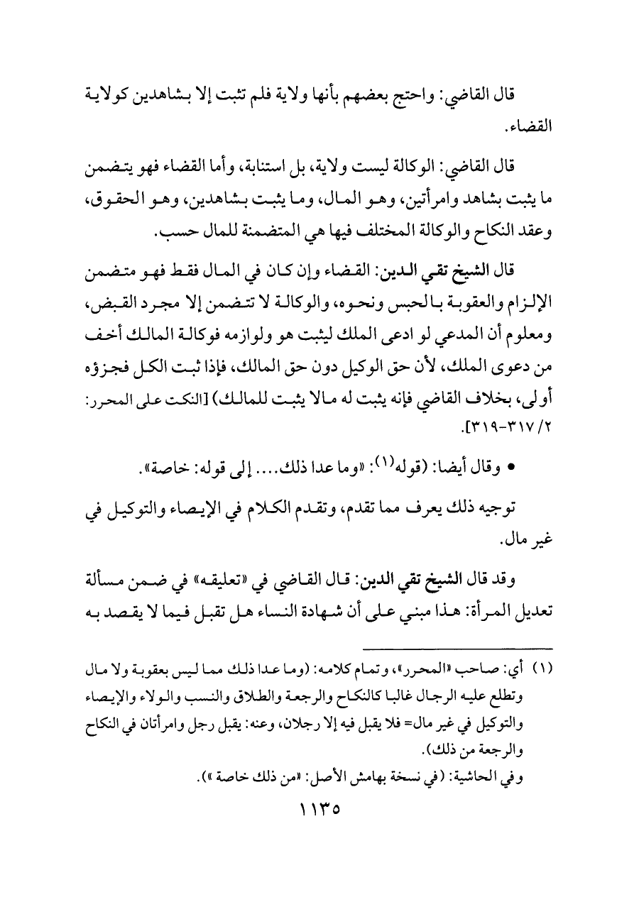 وقد قال الشيخ تقي الدين: قال القاضي في «تعليقه» في ضمن مسألة تعديل المرأة: هذا مبني على أن شهادة النساء هل تقبل فيما لا يقصد به