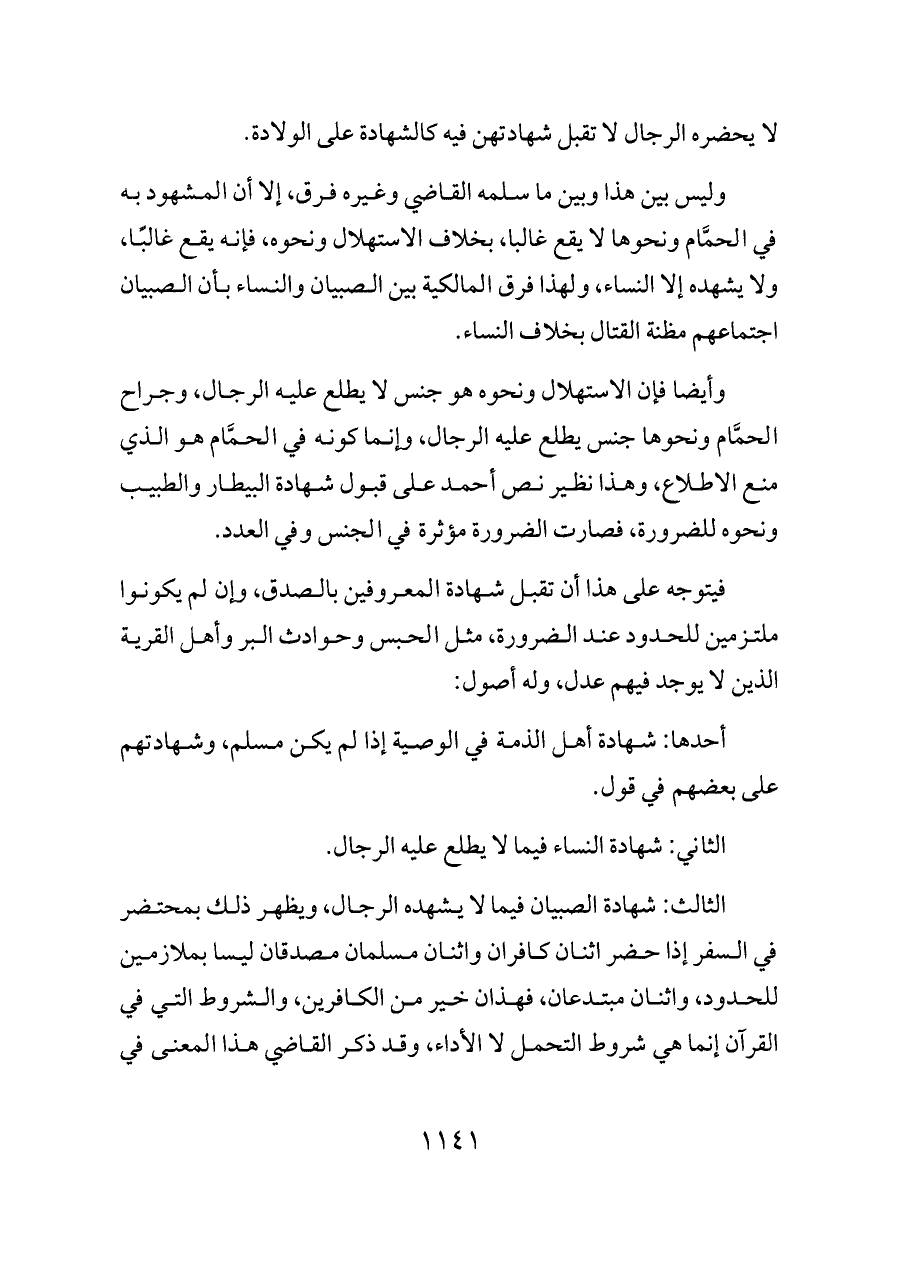 الثالث: شهادة الصبيان فيما لا يشهده الرجال، ويظهر ذلك بمحتضر في السفر إذا حضر اثنان كافران واثنان مسلمان مصدقان ليسا بملازمين للحدود، واثنان مبتدعان، فهذان خير من الكافرين، والشروط التي في القرآن إنما هي شروط التحمل لا الأداء، وقد ذكر القاضي هذا المعنى في
