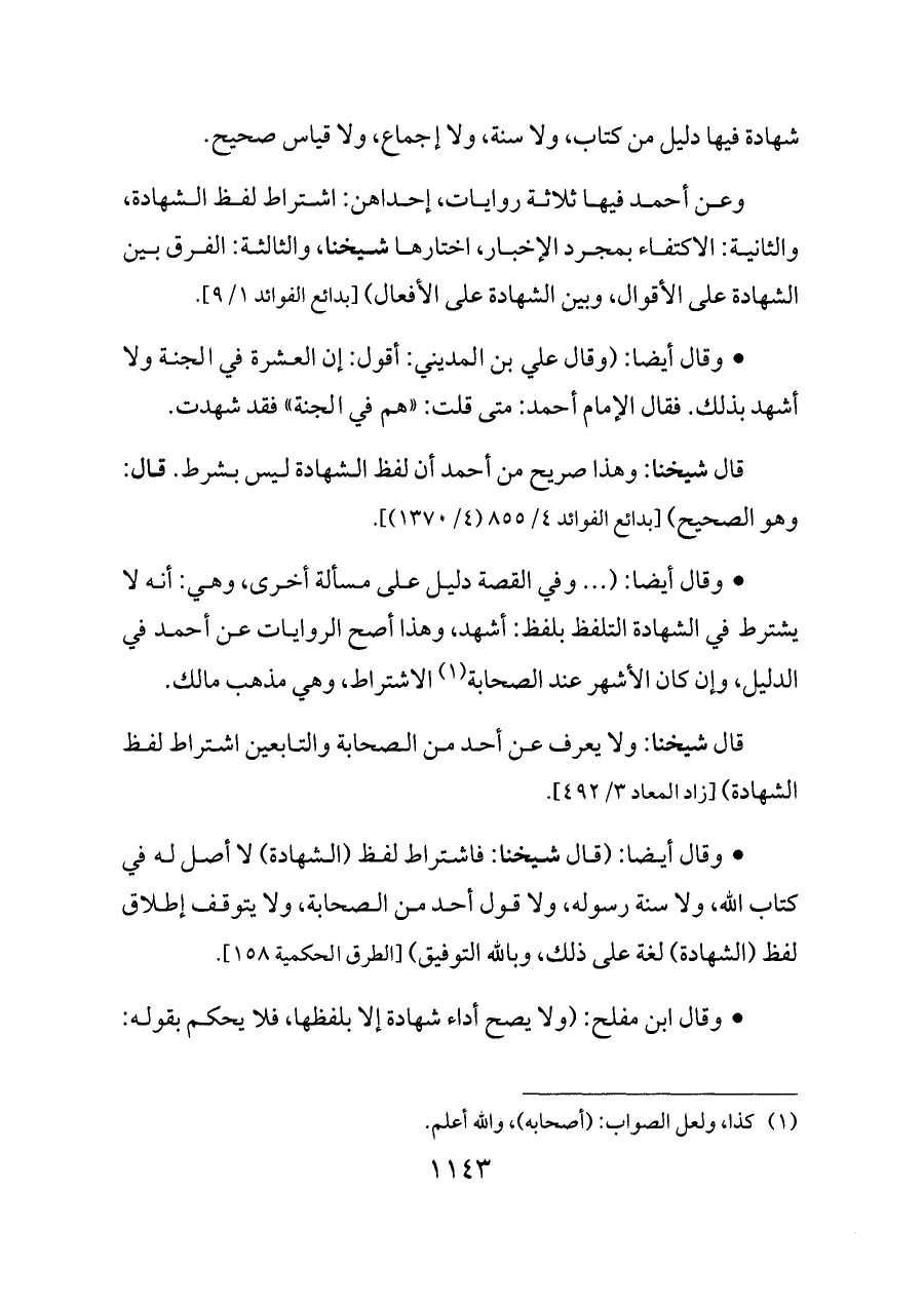 قال شيخنا: وهذا صريح من أحمد أن لفظ الشهادة ليس بشرط. قال: وهو الصحيح) [بدائع الفوائد ٤/ ٨٥٥ (٤/ ١٣٧٠)].