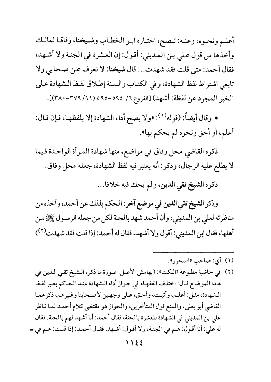 (¬٢) في حاشية مطبوعة «النكت»: (بهامش الأصل: صورة ما ذكره الشيخ تقي الدين في هذا الموضع قال: اختلف الفقهاء في جواز أداء الشهادة عند الحاكم بغير لفظ الشهادة، مثل: أعلم، وأثبت، وأحق، على وجهين لأصحابنا وغيرهم، ذكرهما القاضي أبو يعلى، والمنع قول المتأخرين، والجواز هو مقتضى كلام أحمد لما ناظر علي بن المديني في الشهادة للعشرة بالجنة، فقال أحمد: أنا أشهد لهم بالجنة. فقال له علي: أنا أقول: هم في الجنة، ولا أقول: أشهد. فقال أحمد: إذا قلت: هم في الجنة فقد شهدت أنهم في الجنة.
