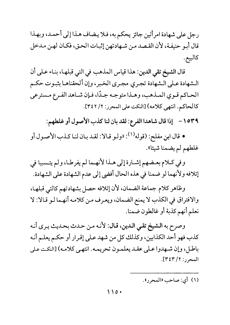 قال الشيخ تقي الدين: هذا قياس المذهب في التي قبلها، بناء على أن الشهادة على الشهادة تجري مجرى الخبر، وإن ألحقناها بثبوت حكم الحاكم قوي المذهب، وهذا متوجه جدًا، فإن شاهد الفرع مسترعى كالحاكم. انتهى كلامه) [النكت على المحرر: ٢/ ٣٤٢].