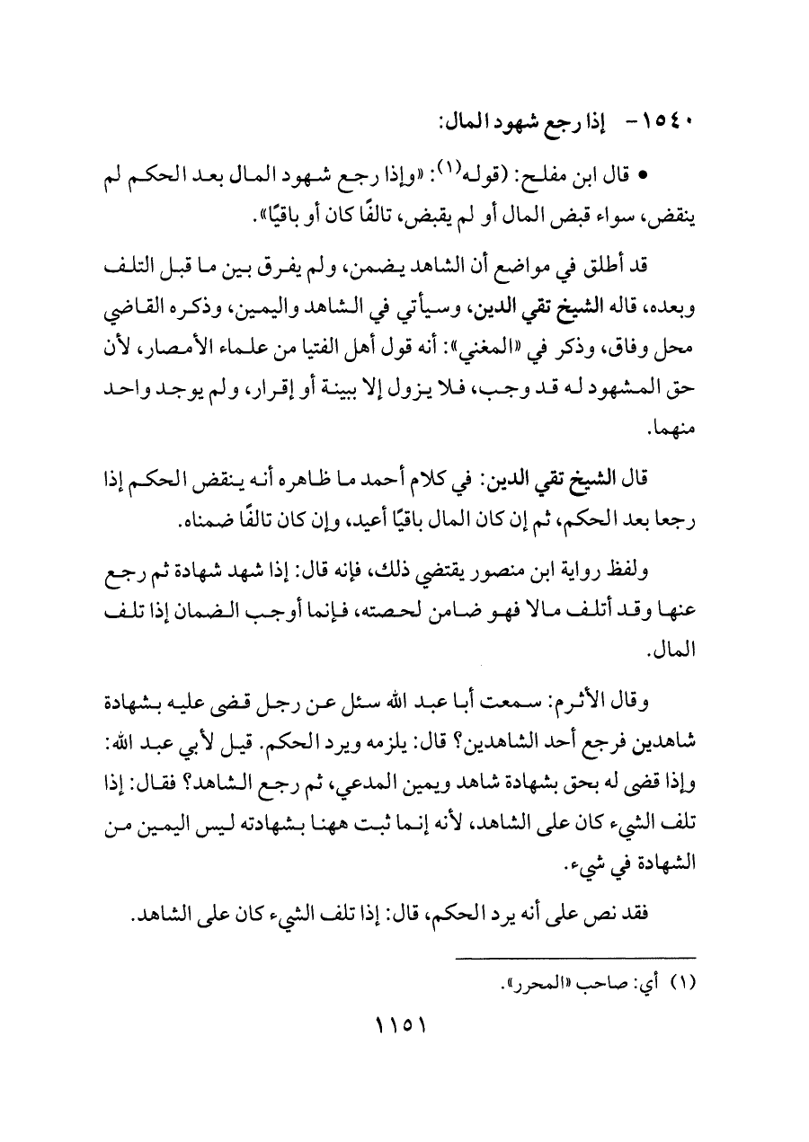 - قال ابن مفلح: (قوله (¬١): «وإذا رجع شهود المال بعد الحكم لم ينقض، سواء قبض المال أو لم يقبض، تالفًا كان أو باقيًا».