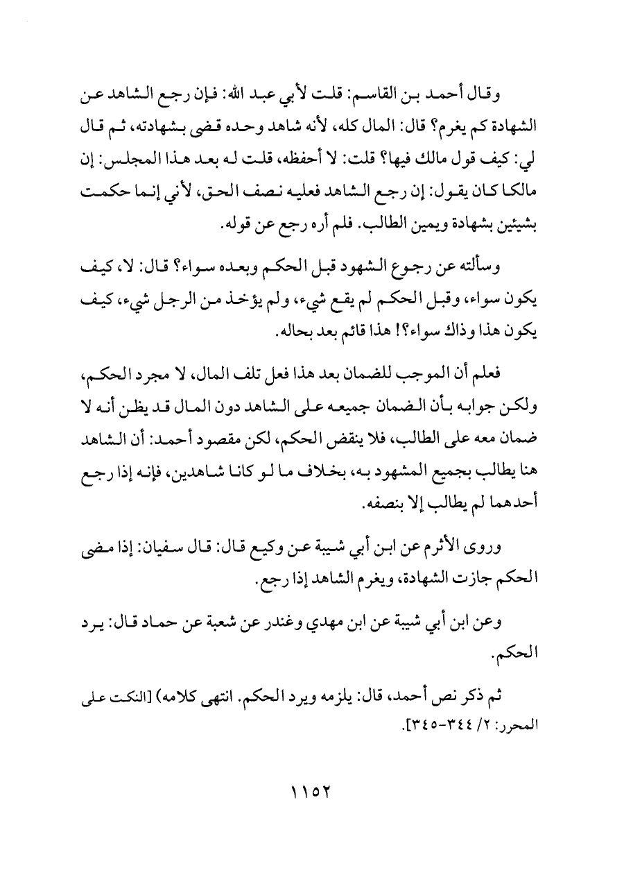 فعلم أن الموجب للضمان بعد هذا فعل تلف المال، لا مجرد الحكم، ولكن جوابه بأن الضمان جميعه على الشاهد دون المال قد يظن أنه لا ضمان معه على الطالب، فلا ينقض الحكم، لكن مقصود أحمد: أن الشاهد هنا يطالب بجميع المشهود به، بخلاف ما لو كانا شاهدين، فإنه إذا رجع أحدهما لم يطالب إلا بنصفه.