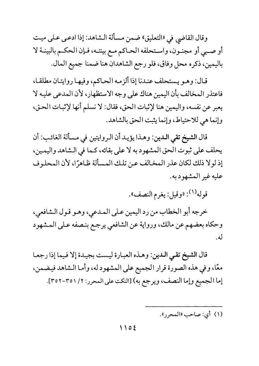 قال الشيخ تقي الدين: وهذه العبارة ليست بجيدة إلا فيما إذا رجعا معًا، وفي هذه الصورة قرار الجميع على المشهود له، وأما الشاهد فيضمن، إما الجميع وإما النصف، ويرجع به) [النكت على المحرر: ٢/ ٣٥١ - ٣٥٢].