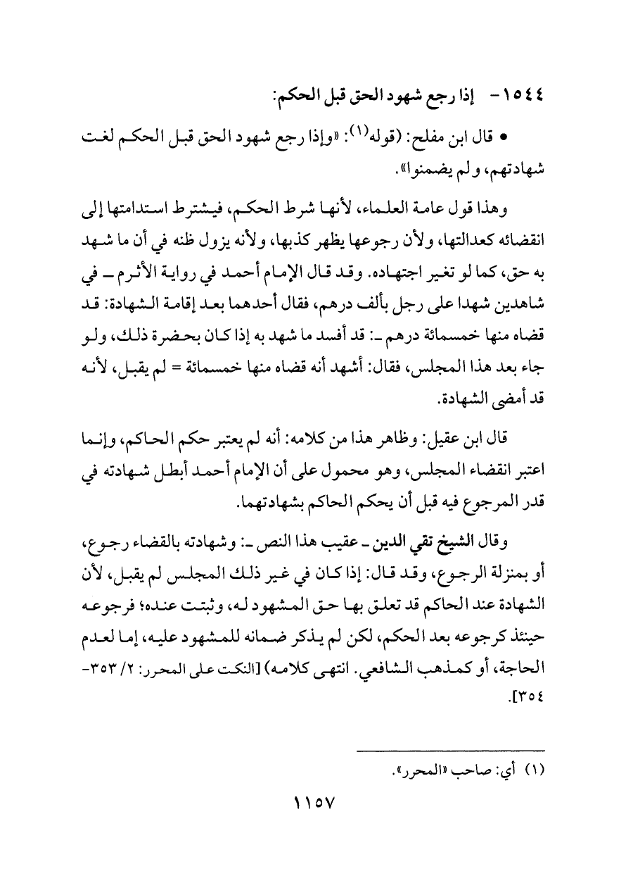 وقال الشيخ تقي الدين ــ عقيب هذا النص ــ: وشهادته بالقضاء رجوع، أو بمنزلة الرجوع، وقد قال: إذا كان في غير ذلك المجلس لم يقبل، لأن الشهادة عند الحاكم قد تعلق بها حق المشهود له، وثبتت عنده؛ فرجوعه حينئذ كرجوعه بعد الحكم، لكن لم يذكر ضمانه للمشهود عليه، إما لعدم الحاجة، أو كمذهب الشافعي. انتهى كلامه) [النكت على المحرر: ٢/ ٣٥٣ - ٣٥٤].