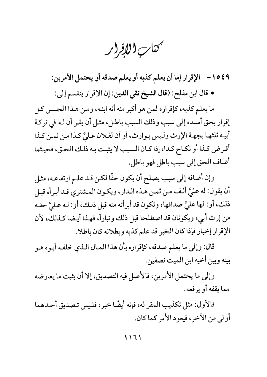 - قال ابن مفلح: (قال الشيخ تقي الدين: إن الإقرار ينقسم إلى: