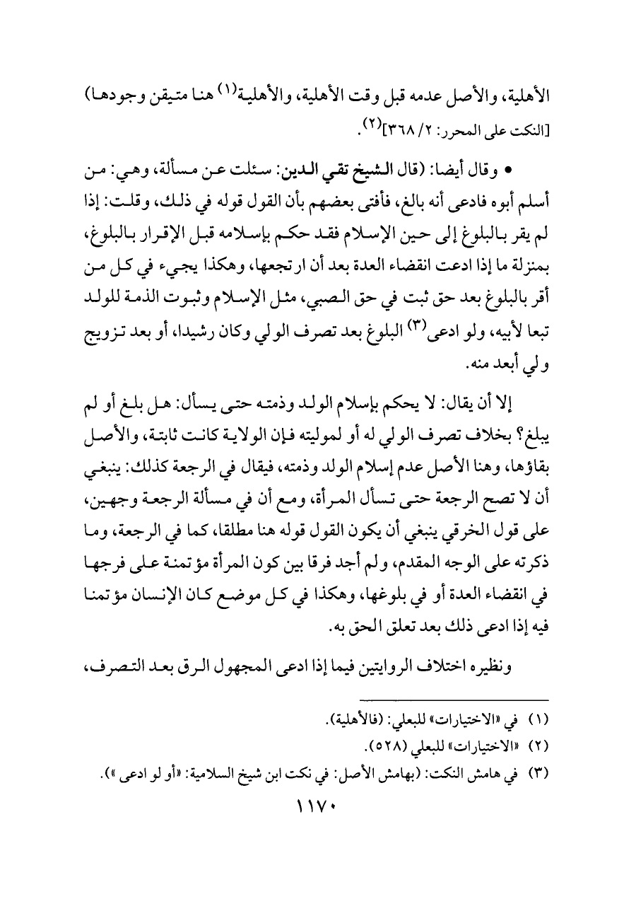 - وقال أيضا: (قال الشيخ تقي الدين: سئلت عن مسألة، وهي: من أسلم أبوه فادعى أنه بالغ، فأفتى بعضهم بأن القول قوله في ذلك، وقلت: إذا لم يقر بالبلوغ إلى حين الإسلام فقد حكم بإسلامه قبل الإقرار بالبلوغ، بمنزلة ما إذا ادعت انقضاء العدة بعد أن ارتجعها، وهكذا يجيء في كل من أقر بالبلوغ بعد حق ثبت في حق الصبي، مثل الإسلام وثبوت الذمة للولد تبعا لأبيه، ولو ادعى (¬٣) البلوغ بعد تصرف الولي وكان رشيدا، أو بعد تزويج ولي أبعد منه.