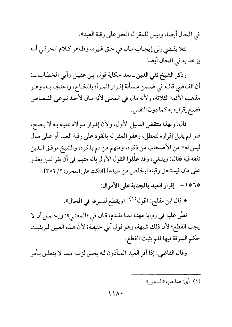 قال: وبهذا ينتقض الدليل الأول، ولأن إقرار مولاه عليه به لا يصح، فلو لم يقبل إقراره لتعطل، وعفو المقر له بالقود على رقبة العبد أو على مال ليس له= من الأصحاب من ذكره، ومنهم من لم يذكره، والشيخ موفق الدين تفقه فيه فقال: وينبغي، وقد علَّلوا القول الأول بأنه متهم في أن يقر لمن يعفو على مال فيستحق رقبته ليخلص من سيده) [النكت على المحرر: ٢/ ٣٨٢].