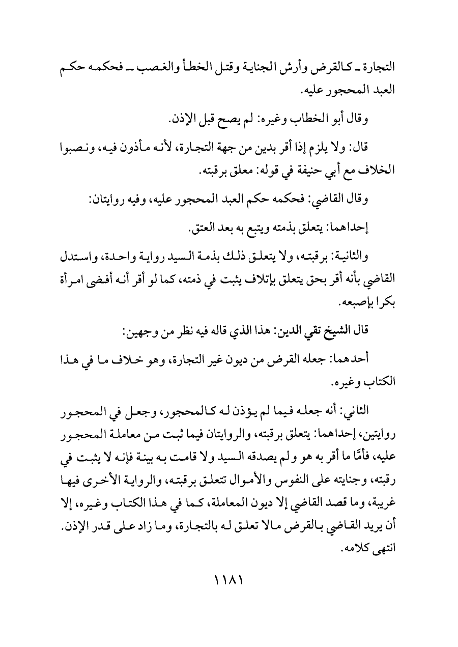 الثاني: أنه جعله فيما لم يؤذن له كالمحجور، وجعل في المحجور روايتين، إحداهما: يتعلق برقبته، والروايتان فيما ثبت من معاملة المحجور عليه، فأمَّا ما أقر به هو ولم يصدقه السيد ولا قامت به بينة فإنه لا يثبت في رقبته، وجنايته على النفوس والأموال تتعلق برقبته، والرواية الأخرى فيها غريبة، وما قصد القاضي إلا ديون المعاملة، كما في هذا الكتاب وغيره، إلا أن يريد القاضي بالقرض مالا تعلق له بالتجارة، وما زاد على قدر الإذن. انتهى كلامه.