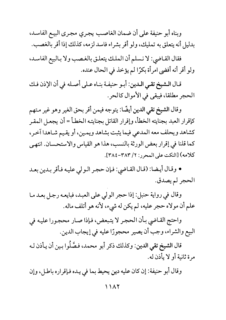 وقال الشيخ تقي الدين أيضًا: يتوجه فيمن أقر بحق الغير وهو غير متهم كإقرار العبد بجنايته الخطأ، وإقرار القاتل بجنايته الخطأ = أن يجعل المقر كشاهد ويحلف معه المدعي فيما يثبت بشاهد ويمين، أو يقيم شاهدا آخر، كما قلنا في إقرار بعض الورثة بالنسب، هذا هو القياس والاستحسان. انتهى كلامه) [النكت على المحرر: ٢/ ٣٨٣ - ٣٨٤].