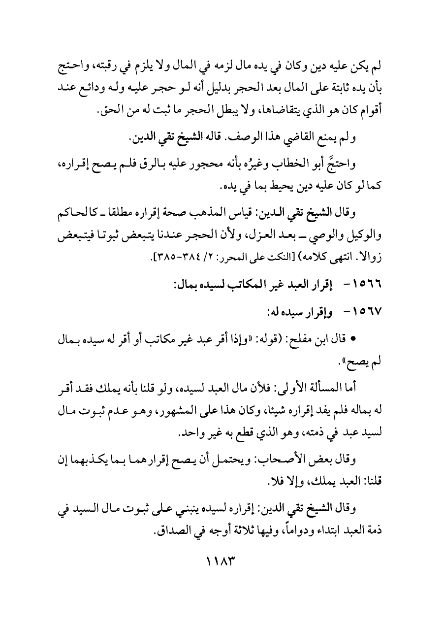 وقال الشيخ تقي الدين: قياس المذهب صحة إقراره مطلقا ــ كالحاكم والوكيل والوصي ــ بعد العزل، ولأن الحجر عندنا يتبعض ثبوتا فيتبعض زوالا. انتهى كلامه) [النكت على المحرر: ٢/ ٣٨٤ - ٣٨٥].