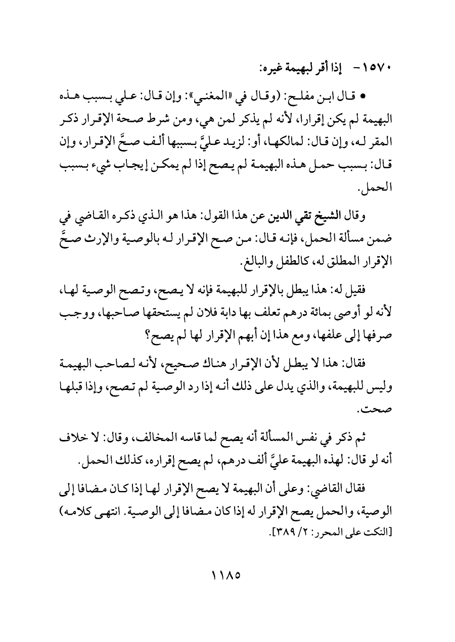 ١٥٧٠ - إذا أقر لبهيمة غيره: