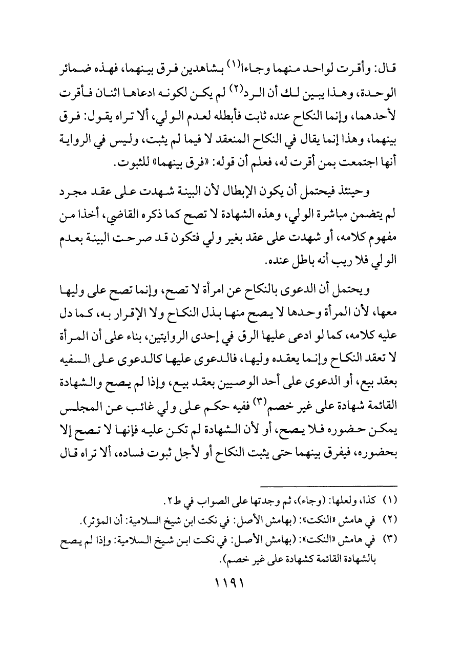 ويحتمل أن الدعوى بالنكاح عن امرأة لا تصح، وإنما تصح على وليها معها، لأن المرأة وحدها لا يصح منها بذل النكاح ولا الإقرار به، كما دل عليه كلامه، كما لو ادعى عليها الرق في إحدى الروايتين، بناء على أن المرأة لا تعقد النكاح وإنما يعقده وليها، فالدعوى عليها كالدعوى على السفيه بعقد بيع، أو الدعوى على أحد الوصيين بعقد بيع، وإذا لم يصح والشهادة القائمة شهادة على غير خصم (¬٣) ففيه حكم على ولي غائب عن المجلس يمكن حضوره فلا يصح، أو لأن الشهادة لم تكن عليه فإنها لا تصح إلا بحضوره، فيفرق بينهما حتى يثبت النكاح أو لأجل ثبوت فساده، ألا تراه قال
