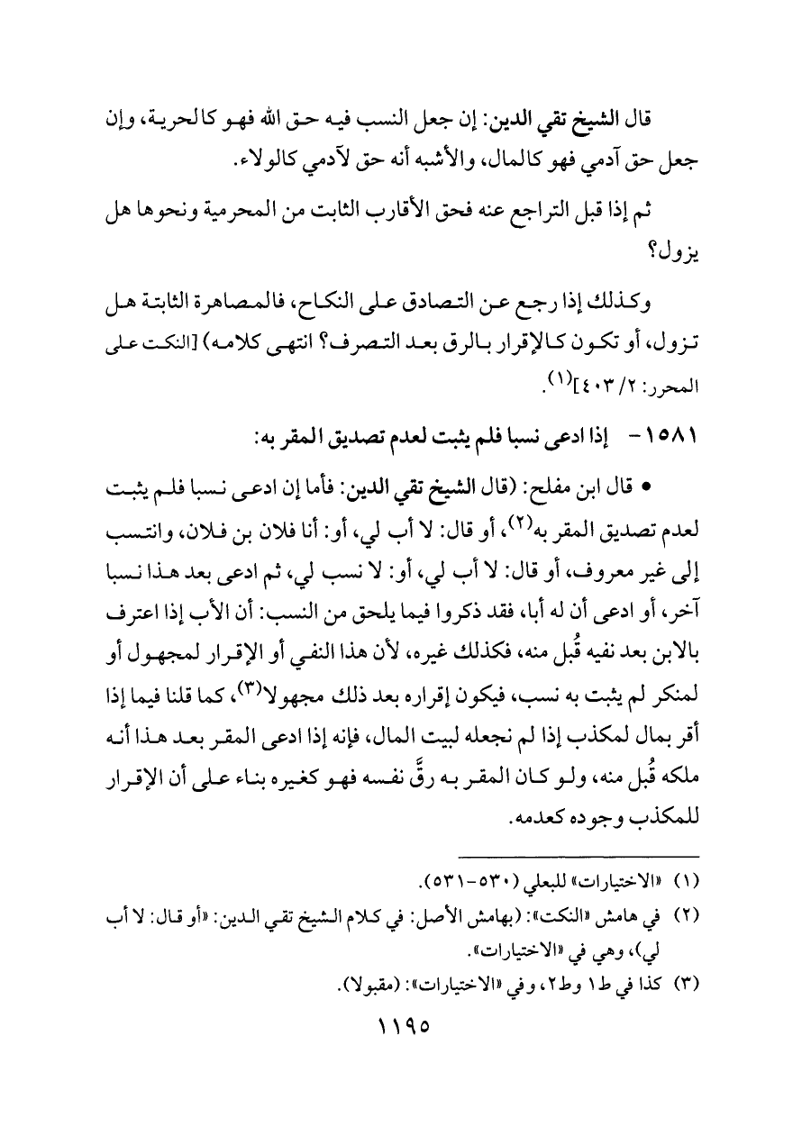 (¬٢) في هامش «النكت»: (بهامش الأصل: في كلام الشيخ تقي الدين: «أو قال: لا أب لي)، وهي في «الاختيارات».