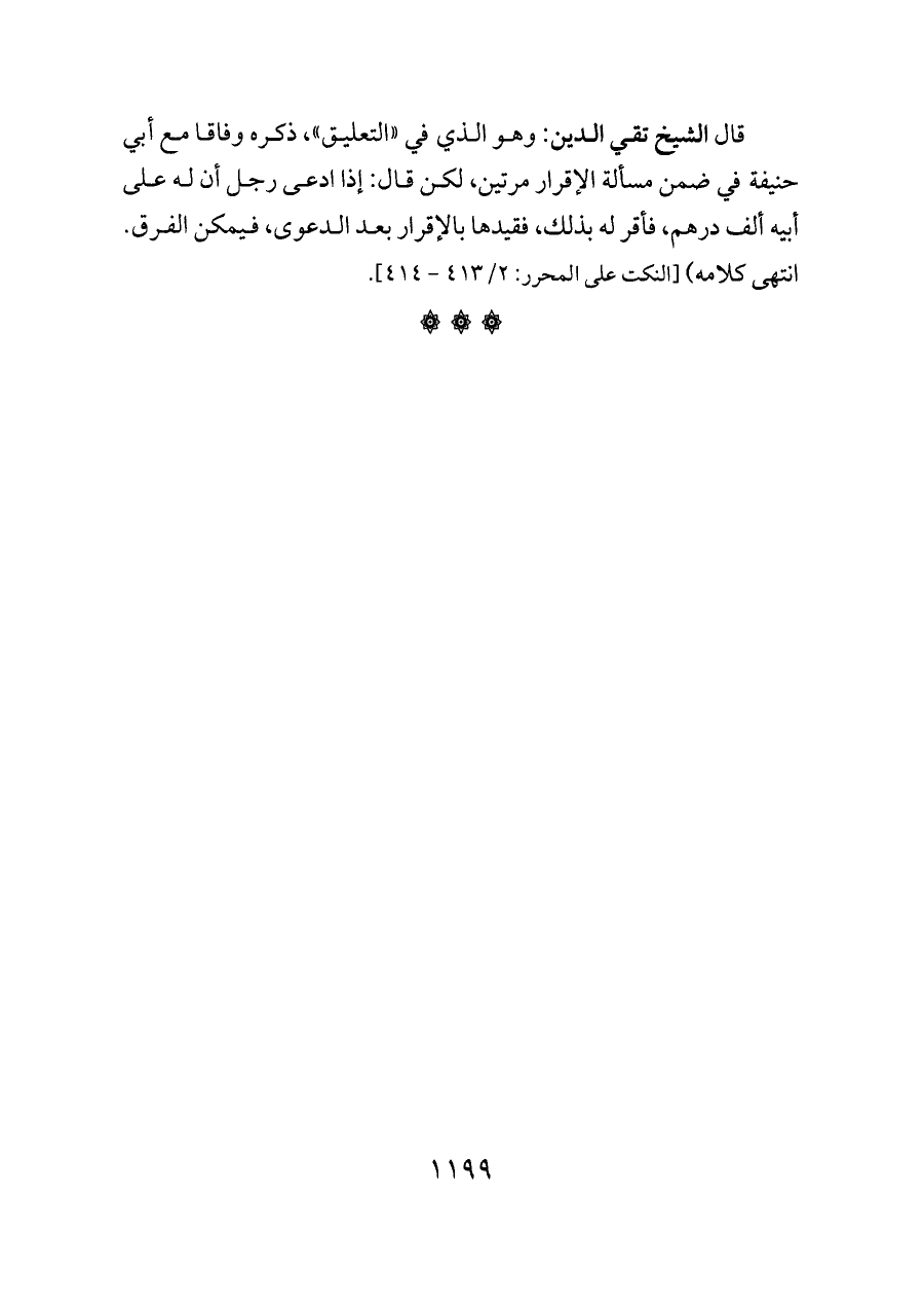 قال الشيخ تقي الدين: وهو الذي في «التعليق»، ذكره وفاقا مع أبي حنيفة في ضمن مسألة الإقرار مرتين، لكن قال: إذا ادعى رجل أن له على أبيه ألف درهم، فأقر له بذلك، فقيدها بالإقرار بعد الدعوى، فيمكن الفرق. انتهى كلامه) [النكت على المحرر: ٢/ ٤١٣ - ٤١٤].